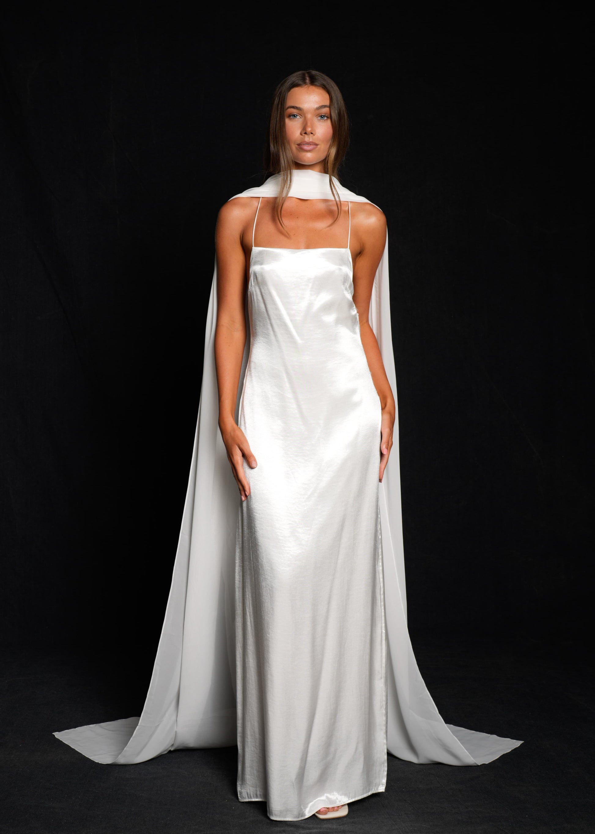 A modern twist on classic bridal styling, the Blair scarf is crafted from softly draping light ivory chiffon for an effortlessly romantic look. Designed with a finished trim for a clean silhouette, it offers a touch more opacity than tulle, making it perfect for brides seeking subtle coverage without sacrificing elegance.
