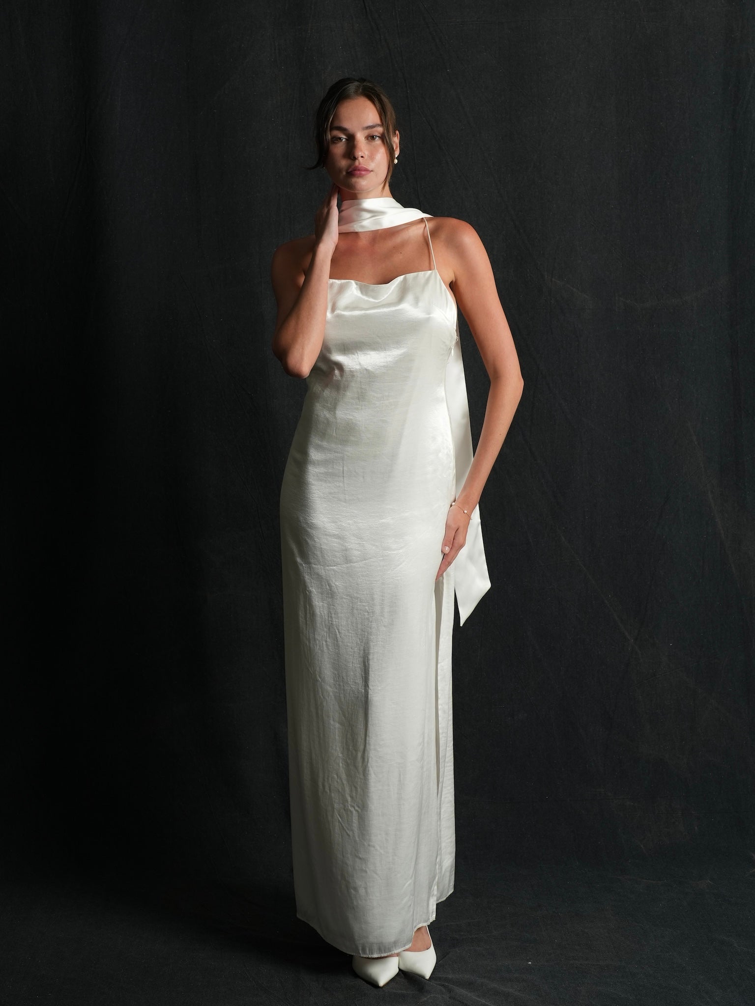 The Liana scarf is a modern, romantic twist on classic bridal styling, crafted from luxurious Mulberry silk. This fingertip-length accessory offers a clean, sophisticated silhouette and is designed for effortless versatility. It transitions gracefully from the ceremony to the reception with an ethereal feel that lasts all day.