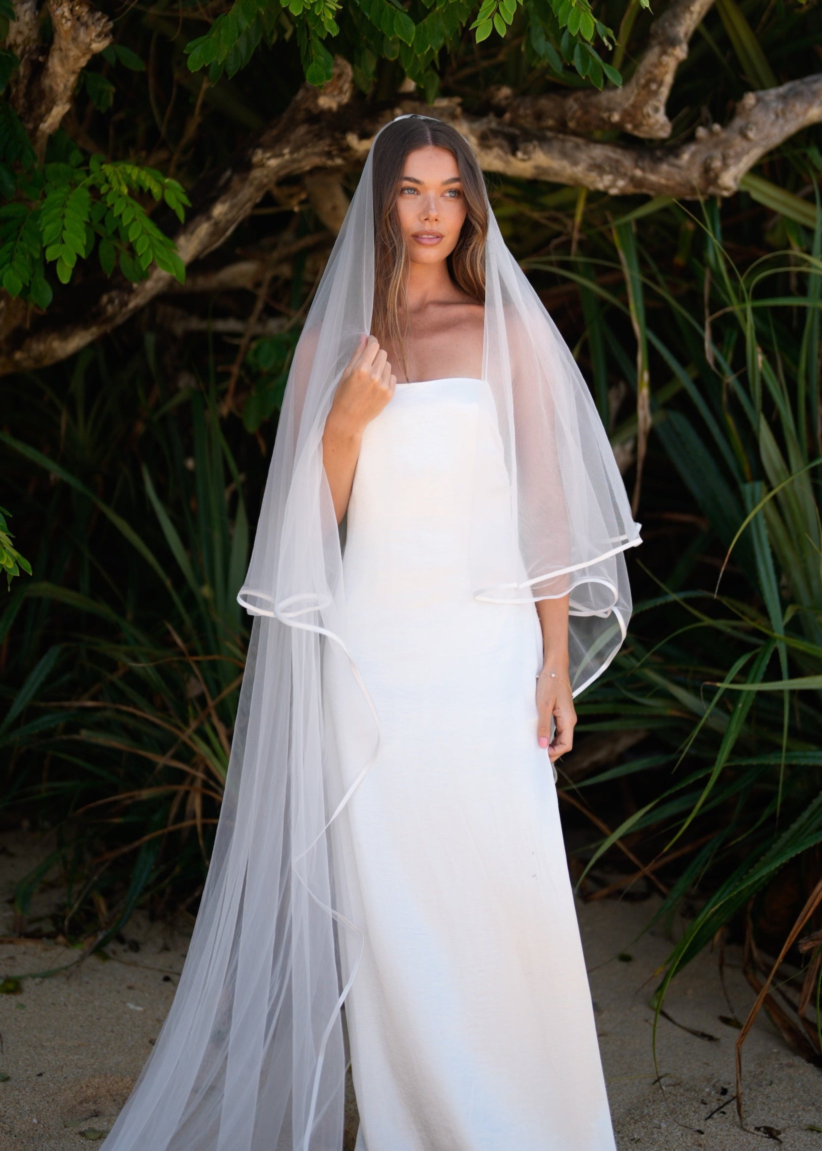 Our Vivienne Two-Tier Satin Edge Cathedral Veil is crafted from our signature soft premium tulle and finished with a sleek satin trim. The satin edge delicately frames your bridal look, adding just the right amount of definition and sophistication. Each veil is secured to a durable metal comb for comfort and ease.