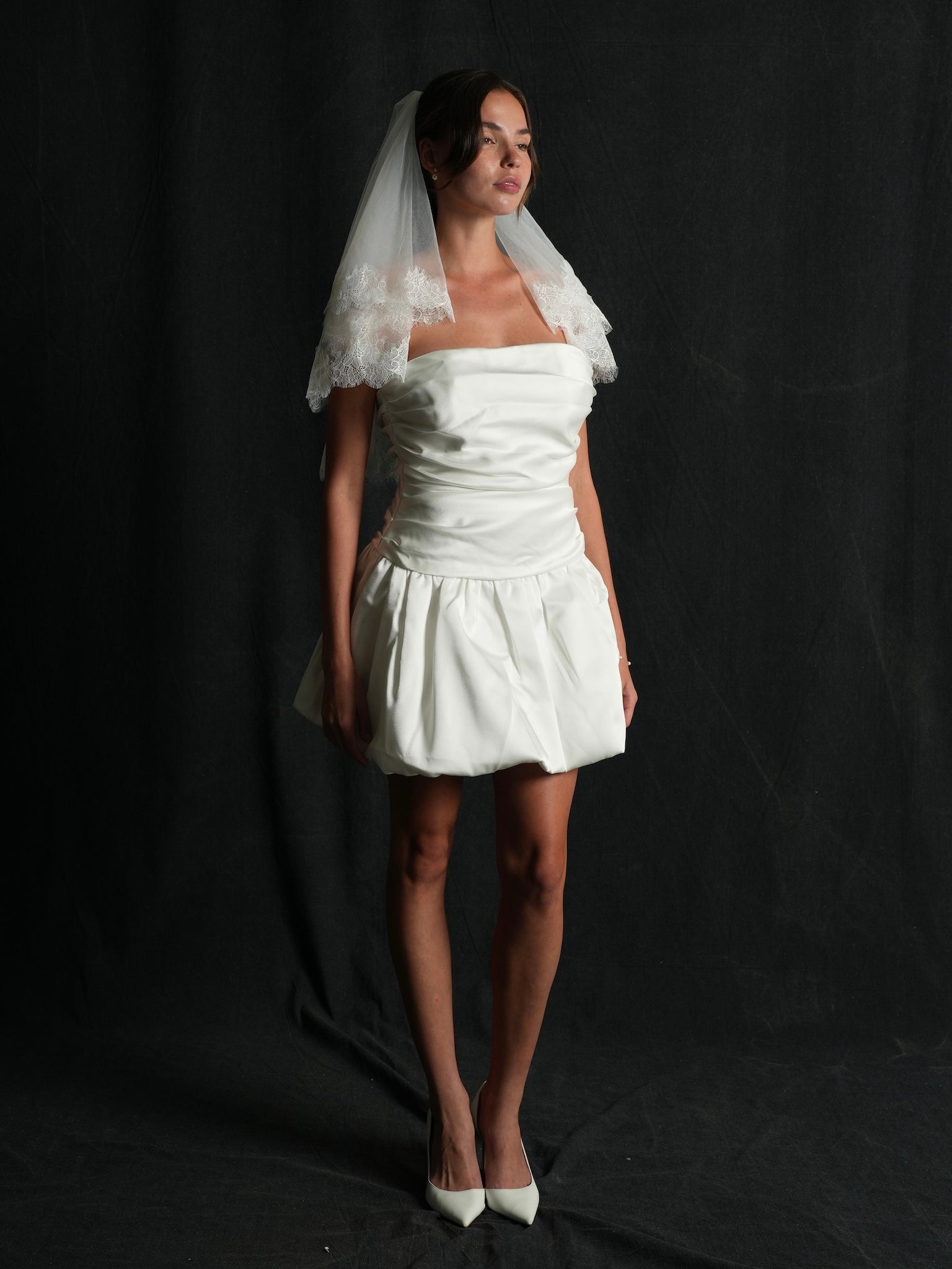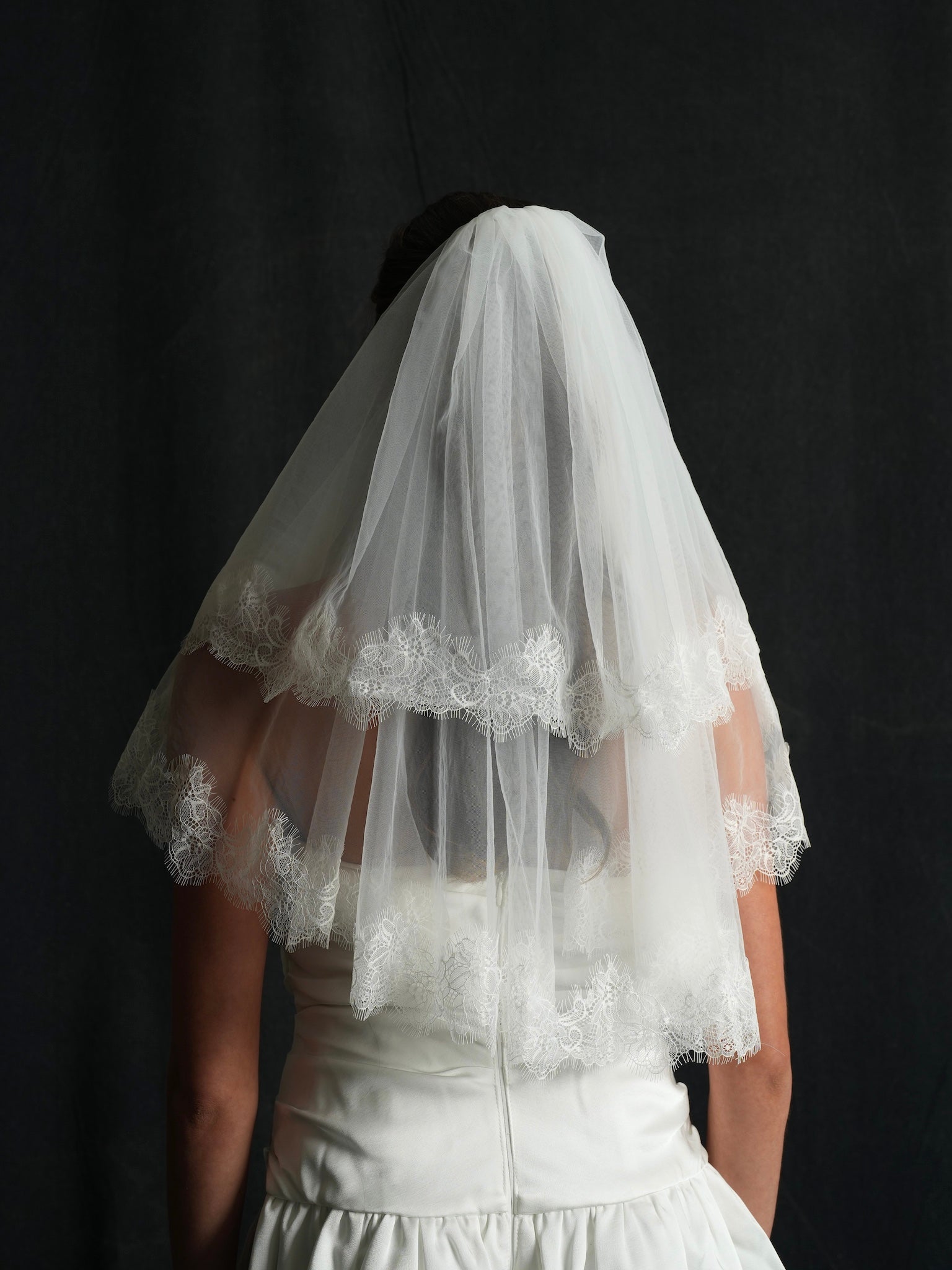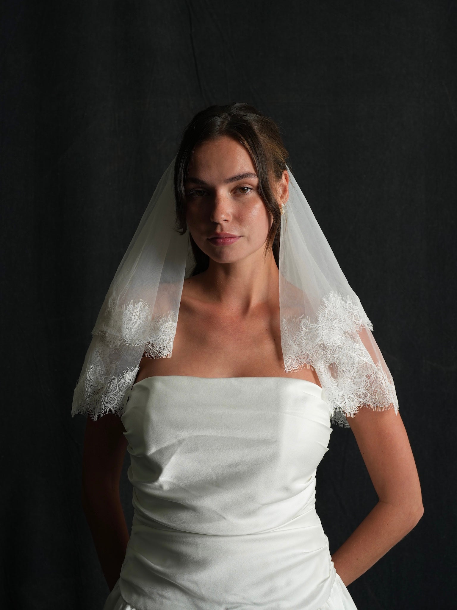 Our Mini Chantilly Lace Veil offers a romantic and vintage-inspired finishing touch to your bridal celebrations. Finished with our delicate Ava lace trim, this short two-tier veil provides a timeless, chantilly-inspired aesthetic. It is the perfect choice for brides seeking a sophisticated, lace-accented look for their bachelorette festivities, or as an elegant and airy "second look" to transition into during the wedding reception.