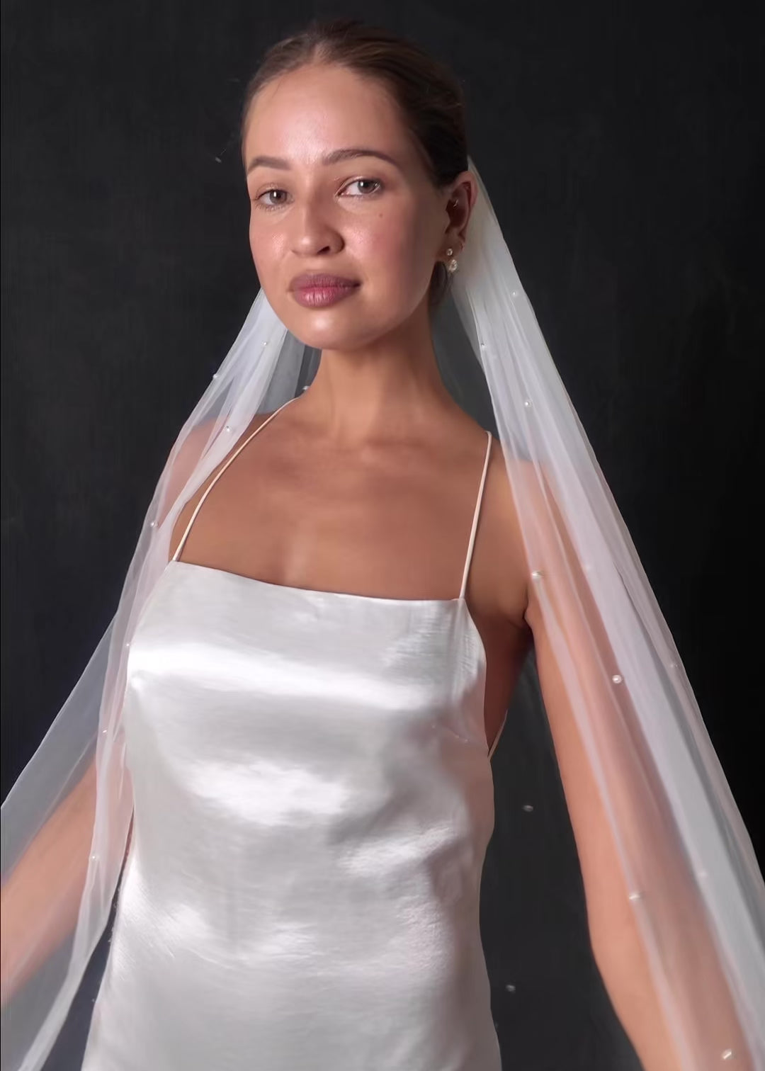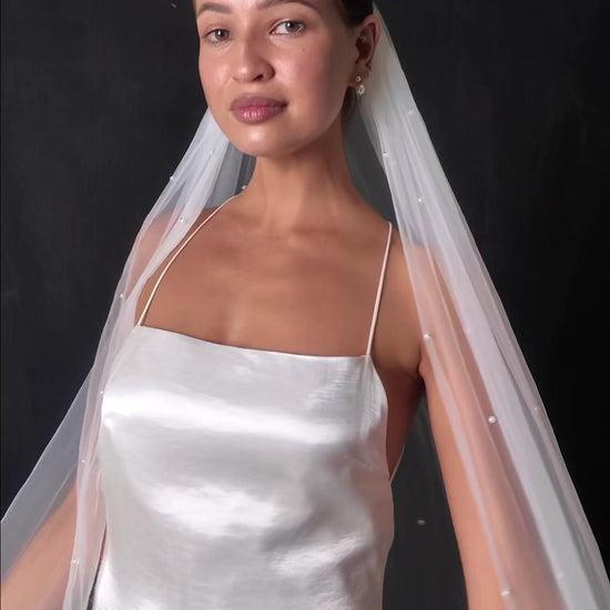 Our single tier cathedral length pearl wedding veil is perfect for brides who appreciate classic beauty with a contemporary twist. This ethereal veil features embellished pearls cascading delicately across our premium soft white tulle, creating a luminous effect that catches the light with every step you take. Our pearl veil pairs beautifully with minimal gowns.
